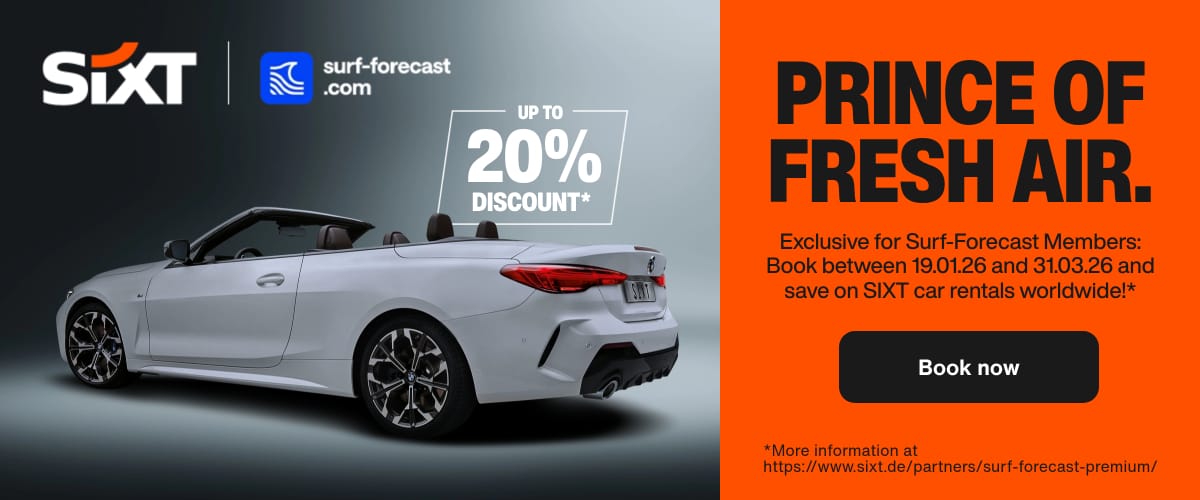 Surf-Forecast users can now save up to 20% on SIXT rental cars worldwide during the promotional period until March 31, 2026.