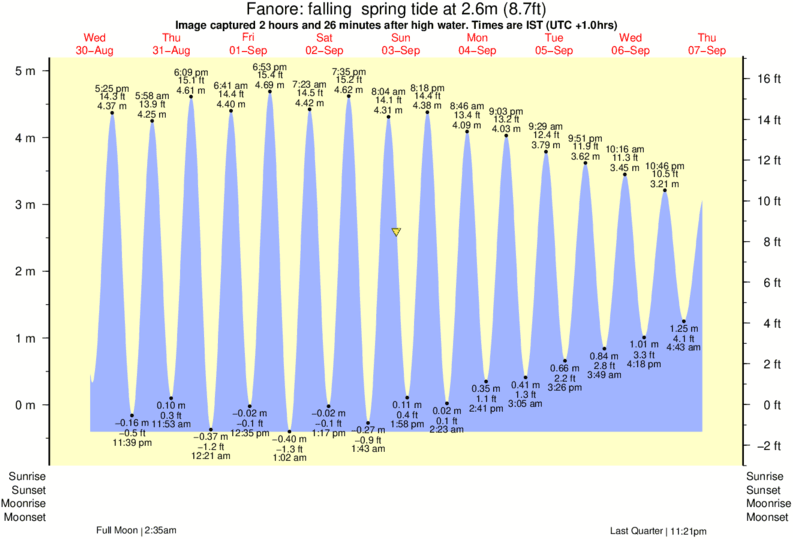 Image captured 2 hours and 26 minutes after high water (falling spring tide). Tide height was 2.6m (8.7 ft). Range 5.09m (16.7 ft). Toggle tide graph